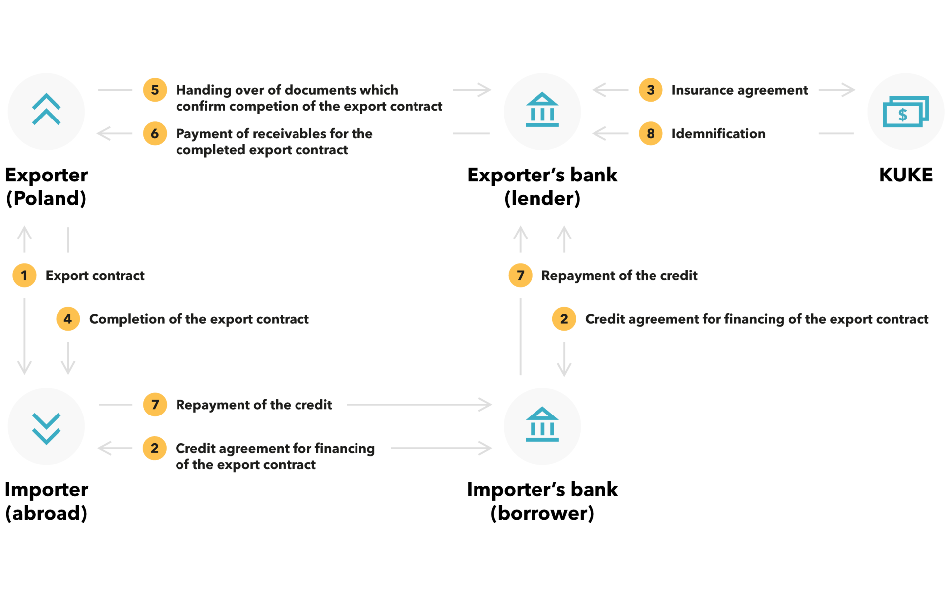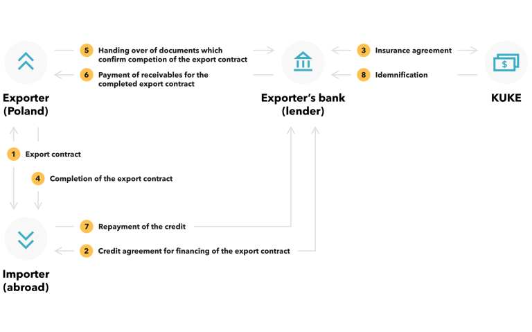 Buyer credit is provided by the bank of the exporter to a specified importer for the purchase of goods or services performed under an export contract. The credit may be granted directly to a foreign contractor of a Polish exporter or a bank of a foreign recipient (in the "bank-to-bank" scheme). Credit installments are paid out to the Polish exporter once a set of pre-defined, supporting documents have been pressented confirming the performence of contractual obligations. After the completion of the delivery or services, the credit is repaid by the importer with a prolonged repayment date. The maximum, admissible repayment term depends on the type of financed project with on average 5 to 10-year insurance cover.