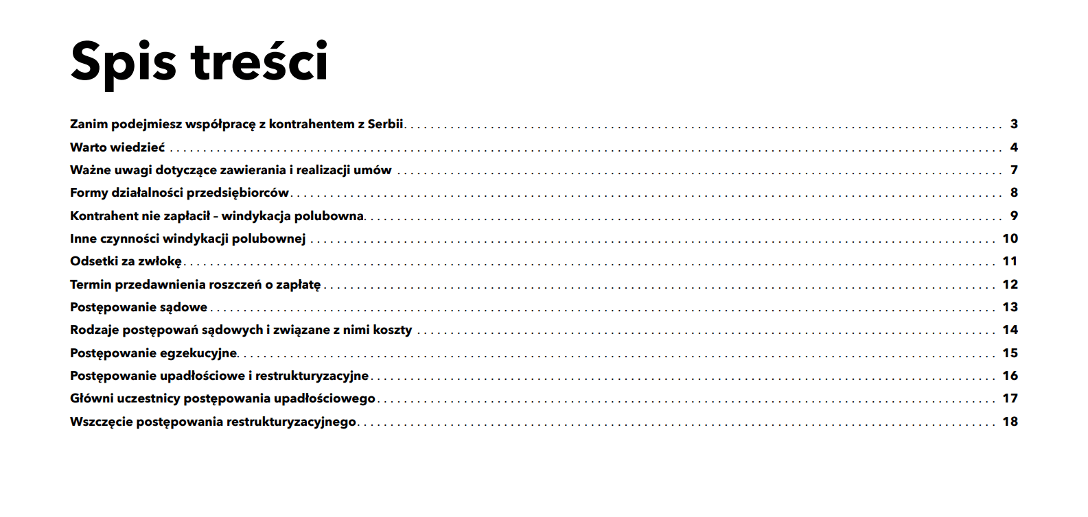 "Tym razem przedstawiamy przewodnik po Serbii. Serbia stanowi dla Polski atrakcyjny rynek, a nasze wzajemne relacje handlowe są z roku na rok coraz silniejsze. Widać też, że wśród naszych klientów Serbia cieszy się zainteresowaniem. Z perspektywy Departamentu Windykacji, wartym odnotowania jest fakt, że skuteczność windykacji polubownej w Serbii jest wysoka, a sam proces windykacji przebiega sprawnie. Przykładowo, w 2024 r. windykacja polubowna trwała średnio około półtora miesiąca. Przewodnik powstał przy wsparciu współpracujących z nami firm windykacyjnych, w szczególności EULEO, Professional Partner SIA, DEBTUS, EWRA".